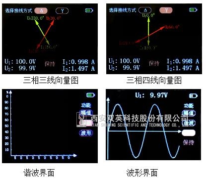 2、2.4寸高分辨率(320*240)真彩色TFT顯示,可顯示電壓和電流真有效值、相位、頻率、功率、功率因數(shù)等電參數(shù),測(cè)量結(jié)果以向量圖、幅值、相位、功率等多種方式顯示。