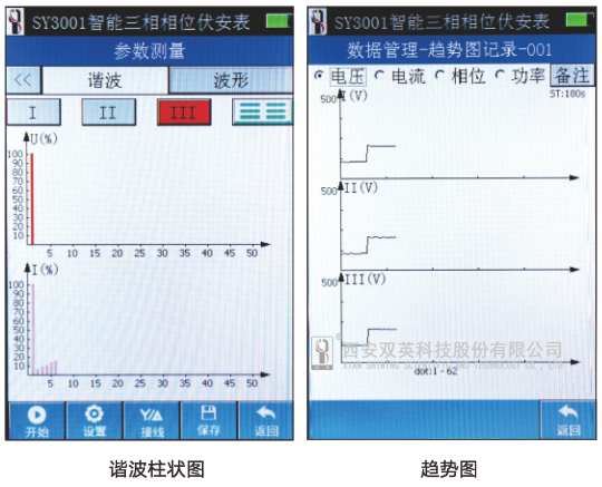 SY3001C智能三相相位伏安表:可用于交流電壓、電流幅值及相位、功率、功率因數(shù)、波形、諧波和頻譜等電參數(shù)測量,并以向量圖或者表格方式等顯示,支持TF卡大容量數(shù)據(jù)存儲,帶有藍牙和USB接口,可以連接智能手機,通過手機實時顯示測量結(jié)果,并通過手機APP擴展更多功能,可實時共享至微信或QQ好友;測量范圍:0-500V、0-10A,精度:電壓0.2級,電流0.5級,相位:±1.0°,測相范圍:電流1mA-5A、電壓3V-500V